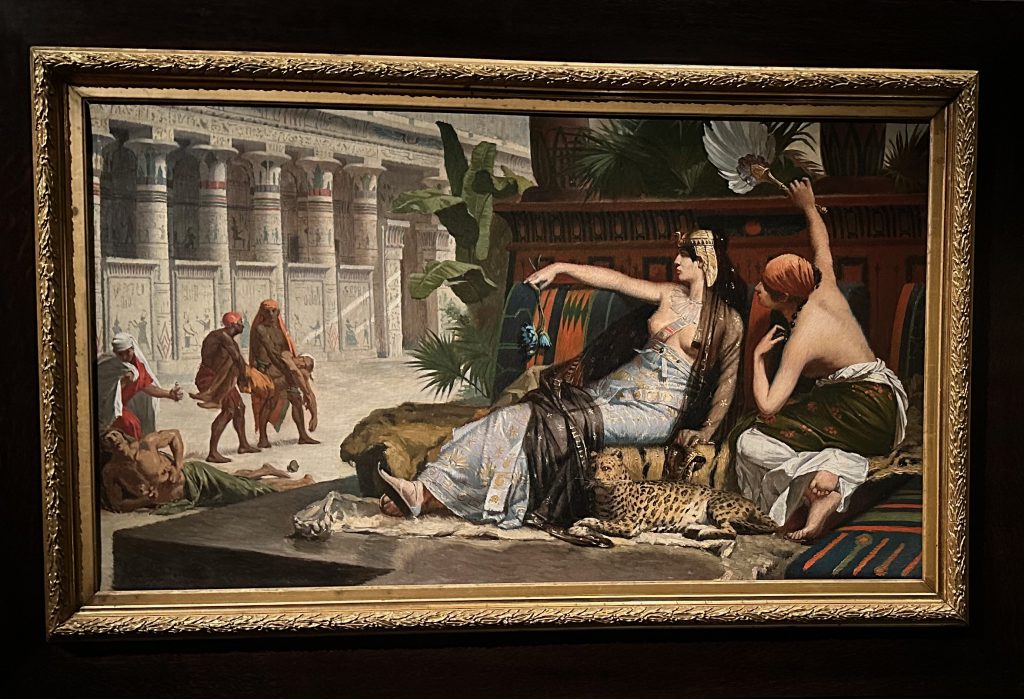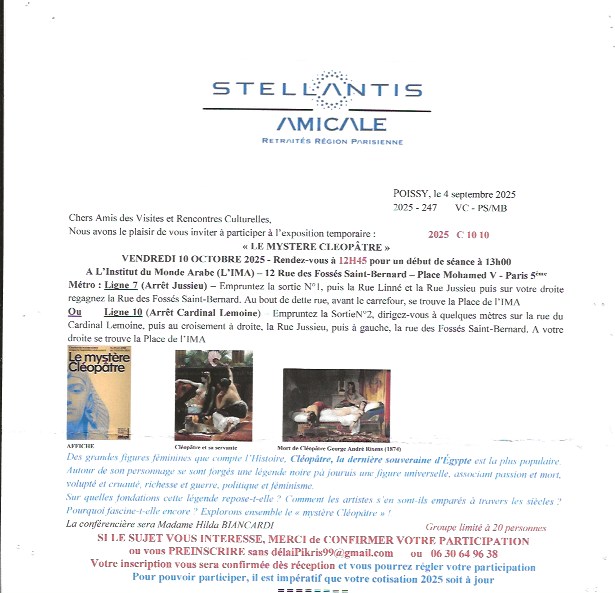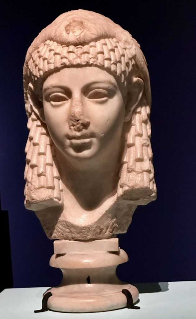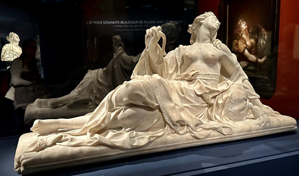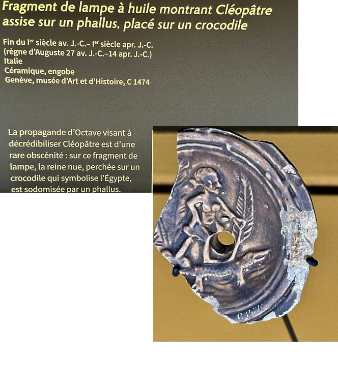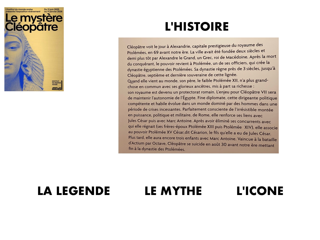 LE MYSTERE CLEOPATRE EXPOSITION à L’IMA PARIS CLEOPATRE MOURANT DEBOUTJULES CESAR MARC ANTOINE AUGUSTECLEOPATRE VII REINE d’AFRIQUEENFANT PEUT-ETRE CESARIONBUSTE DE PTOLEMEE XII PERE de CLEOPATRE TETRADRACHME DE CLEOPATRE VIICARTOUCHE de CLEOPATRE VII et CESARION BAS-RELIEF de LA BATAILLE d’ACTIUMVASES à PARFUM et BIJOIUXFRAGMENTS de PAPYRUSOBJETS POUR LA BEAUTEBUSTE du DIEU SERAPISDIVINITES GECQUES ET EGYPTIENNESMASQUE DORE de MOMIELA REGENTRE MAITRESSE DES DEUX TERRESMANUSCRIT CONQUETE de L’EGYPTE FRAGMENT LAMPE à HUILEDES NEZ EN MARBRE par ESMERALDA KOSMATOPOULOSCLEOPATRE par LAVINIA FONTANA vers 1585 CLEOPATRE par MICHELE TOSINI attribution incertaineCLEOPATRE SE DONNANT LA MORT par CLAUDE VIGNON vers 1650CLEOPATRE MOURANT par Francois BAROIS Marbre 1700CLEOPATRE DISSOUS LA PERLE sans UNE COUPE de VIN par CARLO MARATTICLEOPATRE MONTRE à OCTAVE LE BUSTE de CESAR par POMPEO BATONILA MORT de CLEOPATRE par J A RIXENS 1874 CLEOPATRE ESSAYANT des POISONS SUR DES CONDAMNES à MORT par CABANELMAQUETTE DE DECORBIJOUX EXOTIQUESSARAH BERNHARDT dans LE ROLE de CLEOPATRECOSTUME d’ELISABETH TAYLORCOSTUMES DU FILM ASTERIXCLEOPATRE REINE DU MARKETINGLE NATIONALISME EGYTPIENUNE ICONE FEMINISTE de CINDY SHERMANLA MORT de CLEOPATRE par NAZANIN POUYAN DEH 2022 ARTISTE IRANIENNEESMARALDA KOSMATOUPOULOSRONE par BARBARA CHASE RIBOUD 1987