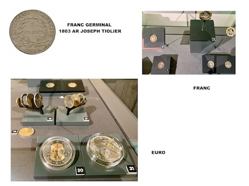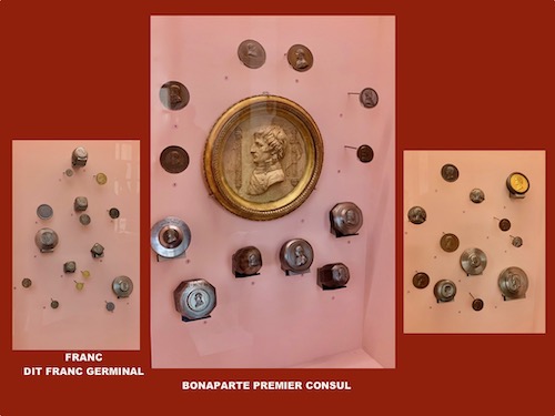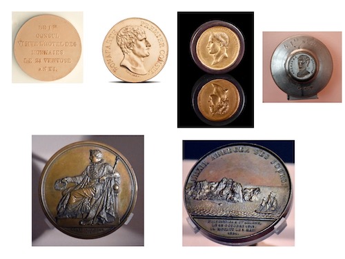 La Monnaie de Paris : « Sur les pas de Napoléon, pour le meilleur et pour l’Empire En 1803, Bonaparte lance une réforme monétaire pour offrir aux citoyens un moyen de paiement stable, le franc germinal, après des années de crise financière. Son effigie est alors choisie comme image pour figurer sur cette nouvelle monnaie. C’est le graveur Denon, devenu directeur de la Monnaie des Médailles, qui orchestre alors la mise en scène de la propagande de Napoléon Ier par l’image, en racontant sur les médailles, victoires et grands actes de gouvernance de l’Empereur, comme la Bataille d’Austerlitz. Médailles qui sont les vecteurs de communication particulièrement efficace, pour édifier son pouvoir et sa gloire.